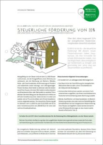 Endlich ist sie da – die steuerliche Förderung! Mit diesem neuen Förderinstrument haben Hausbesitzer, die ihre Immobilie für private Wohnzwecke nutzen, nun die Möglichkeit, diese energetisch auf Vordermann zu bringen und gleichzeitig drei Jahre lang von Steuervorteilen zu profitieren.