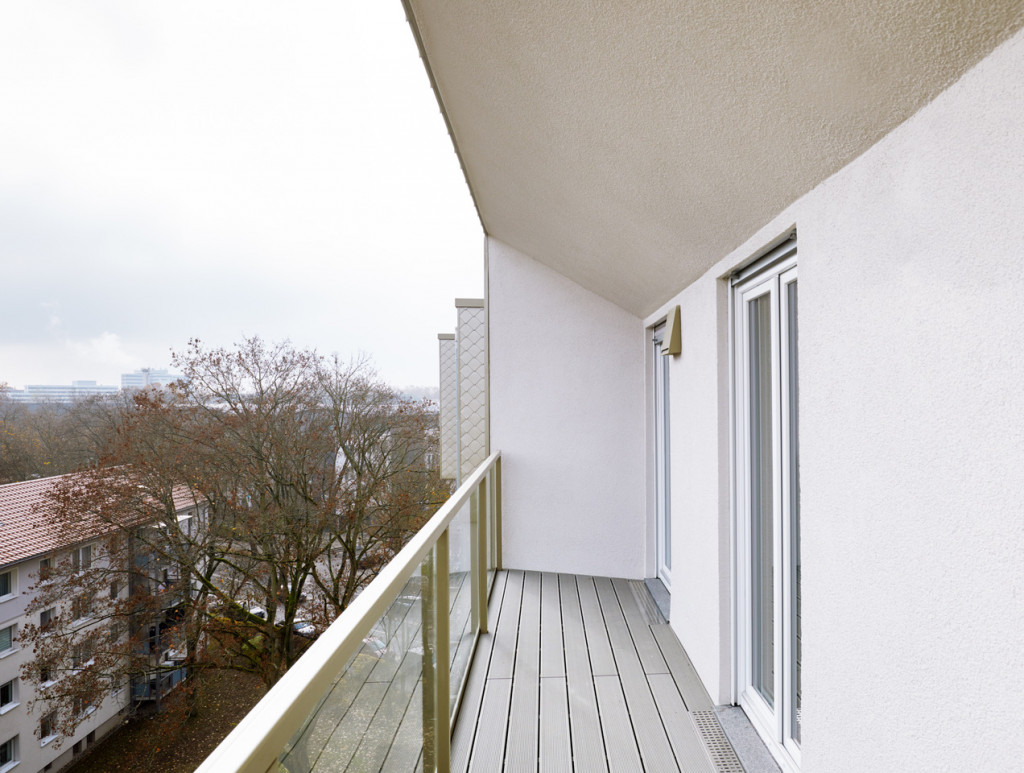 Die Architekten planten die Sanierung der Bäder, Oberflächen sowie der Gebäude- und Heiztechnik. Sie überdämmten die Bestandsfassade mit einem 16 cm starken Wärmedämmverbundsystem, ließen neue Fenster mit zeitgemäßem Wärme- und Schallschutz einbauen und tauschten die alten Balkone gegen Loggien. Die lassen sich jetzt mit gläsernen Falt-Schiebeläden gegen Lärm abschotten.