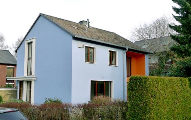 Insgesamt gelang dem Architekten und seinen Bauherren mit dem Umbau der Spagat zwischen den Wohnansprüchen von heute und dem kleinbürgerlichen Charakter von 1968. Während er also innen Platz und Licht schuf, mit weißen Oberflächen, weiten Raumperspektiven, Glastüren und zeitgemäßem, griff- und schnörkellosen Küchendesign, setzt er außen auf Proportionen und Farben, die an die 1960er Jahre erinnern: in hellblauem Putz mit orange gefärbter Balkonnische und braunen, filigranen Holzfenstern.